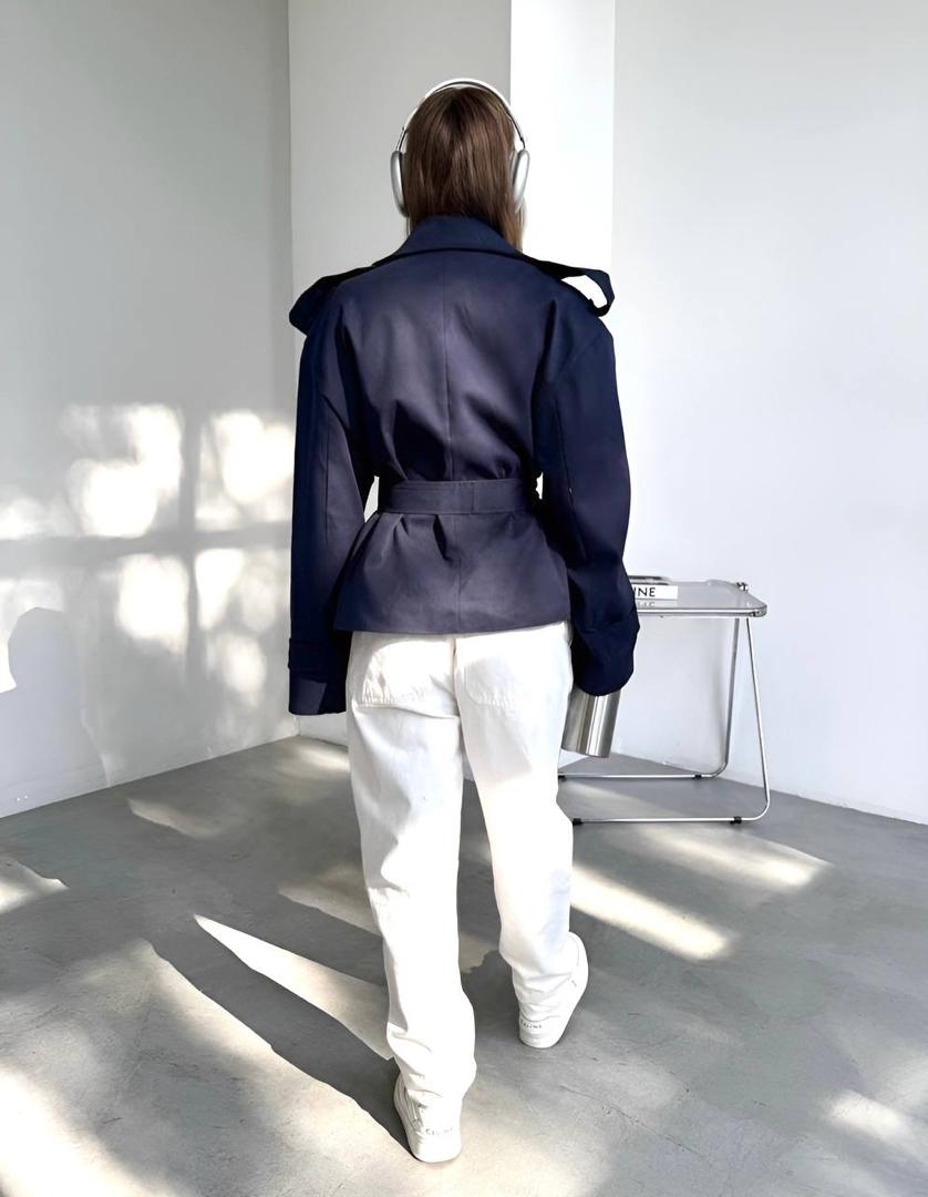 ترنچ کت با فرم آزاد طراحی شده و اندازه های آن اندکی از جدول سایز بندی بزرگ تر است.مدل با سایز 38 ، سایز 1 این ترنچ کت را به تن دارد.
