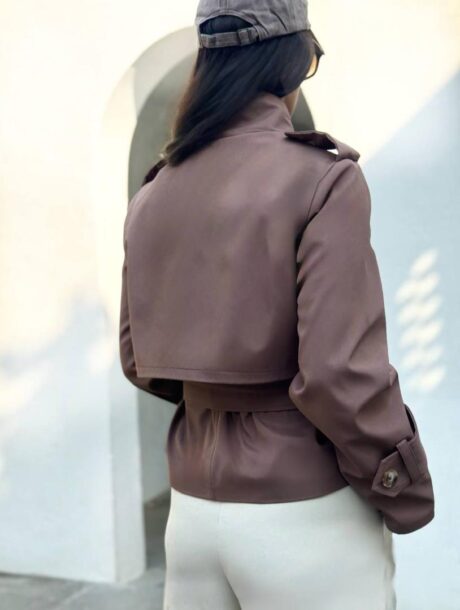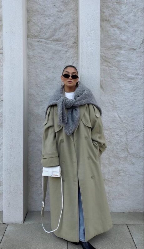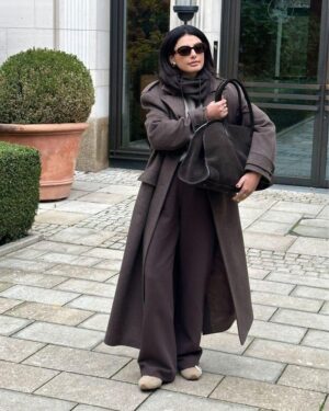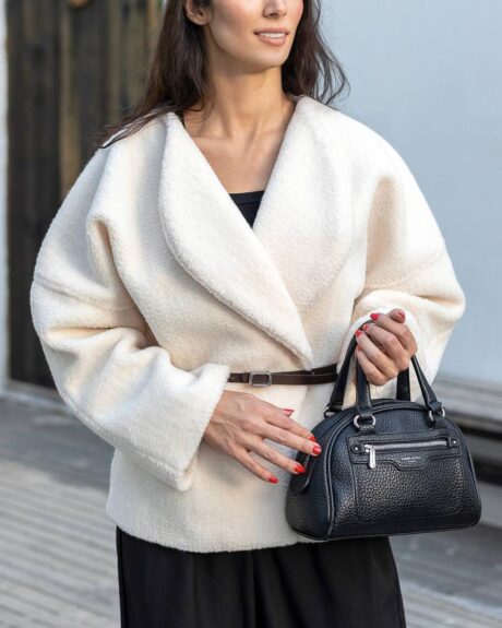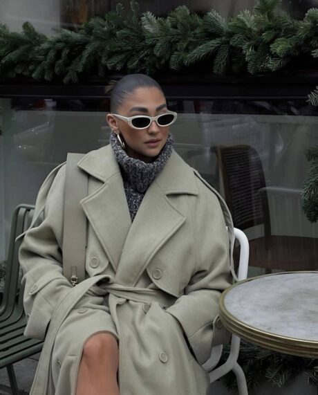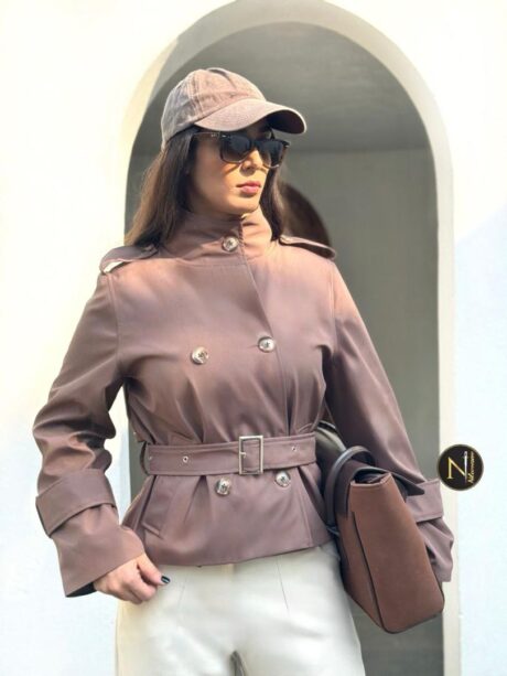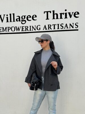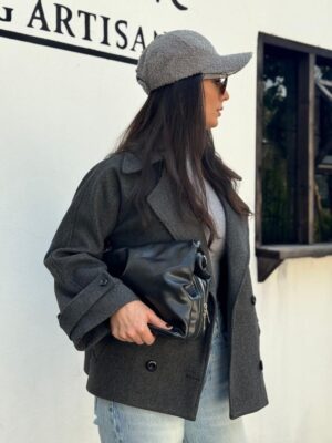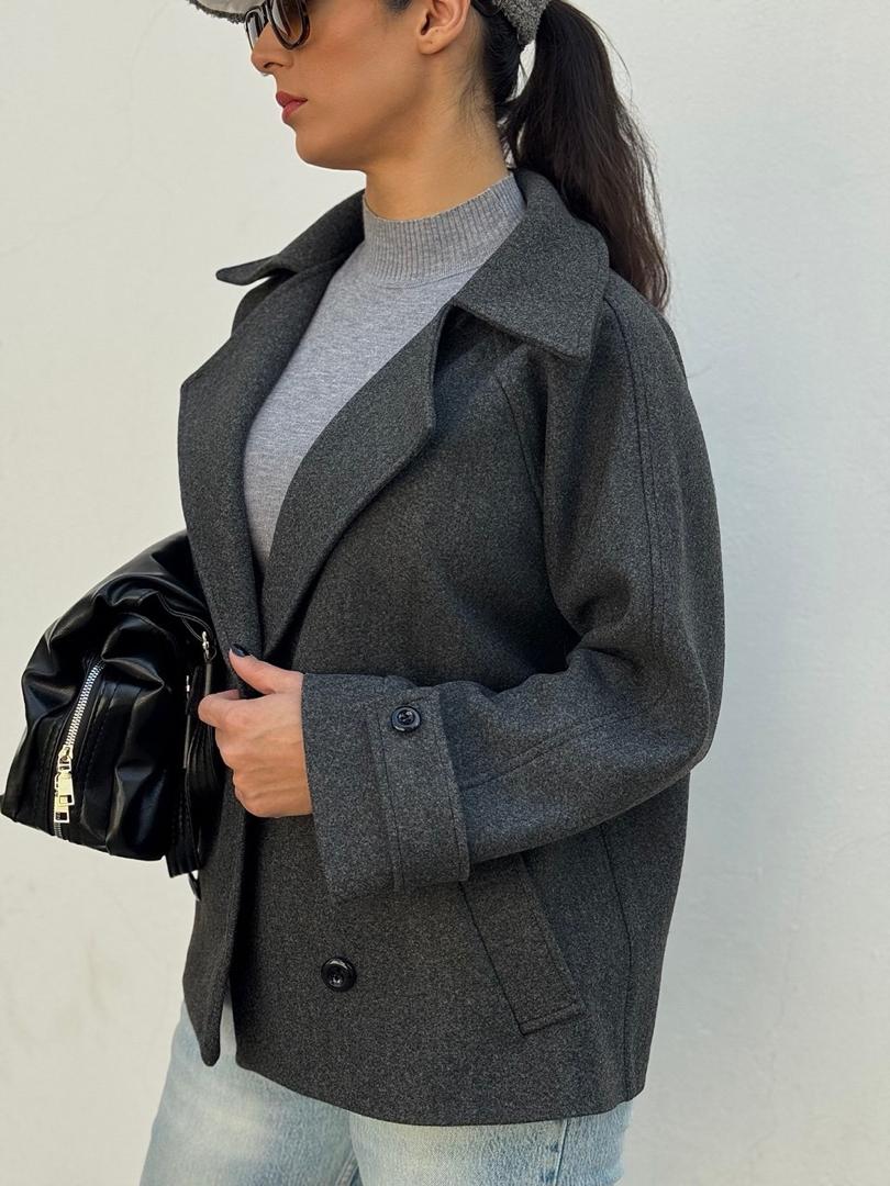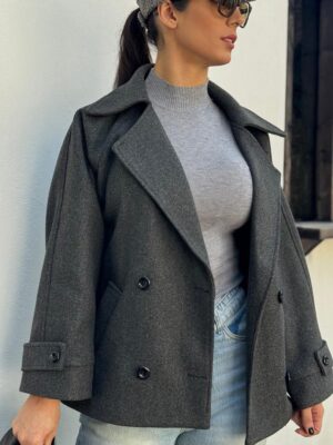 پالتو با فرم آزاد طراحی شده و اندازه های آن اندکی از جدول سایز بندی بزرگ تر است.مدل با سایز 38 ، سایز 1 این پالتو را به تن دارد.
